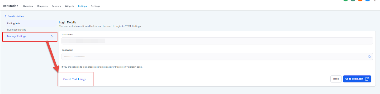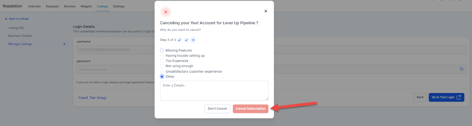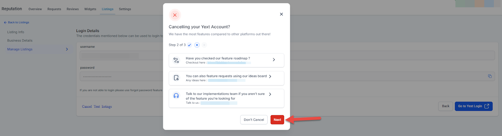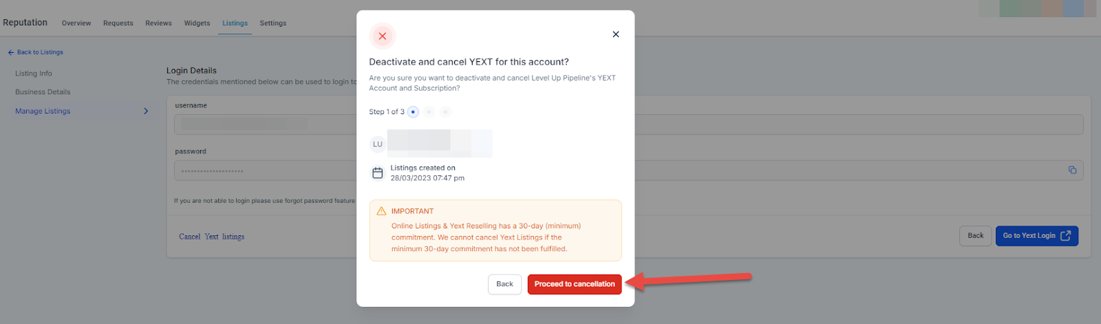 Cancel Yext Listings: Click on the Cancel Yext Listings button to open the cancellation dialog.