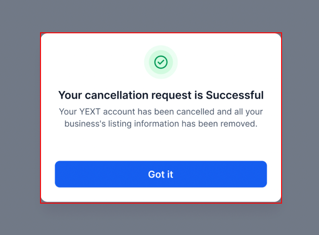 A: If your attempt to cancel Yext listings fails, an error message will appear. In such cases, please submit a cancellation request to our support team for further assistance.