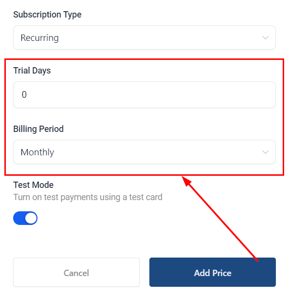 4. Set the trial period (if offered) and decide on the billing cycle—either Monthly or Annually. Set Trial and Billing Period