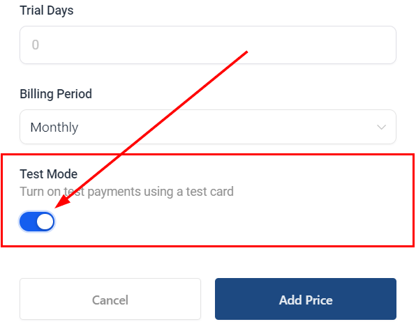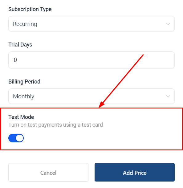 5. Enable Test Mode to validate the payment workflow without real charges. Test Mode for Subscription