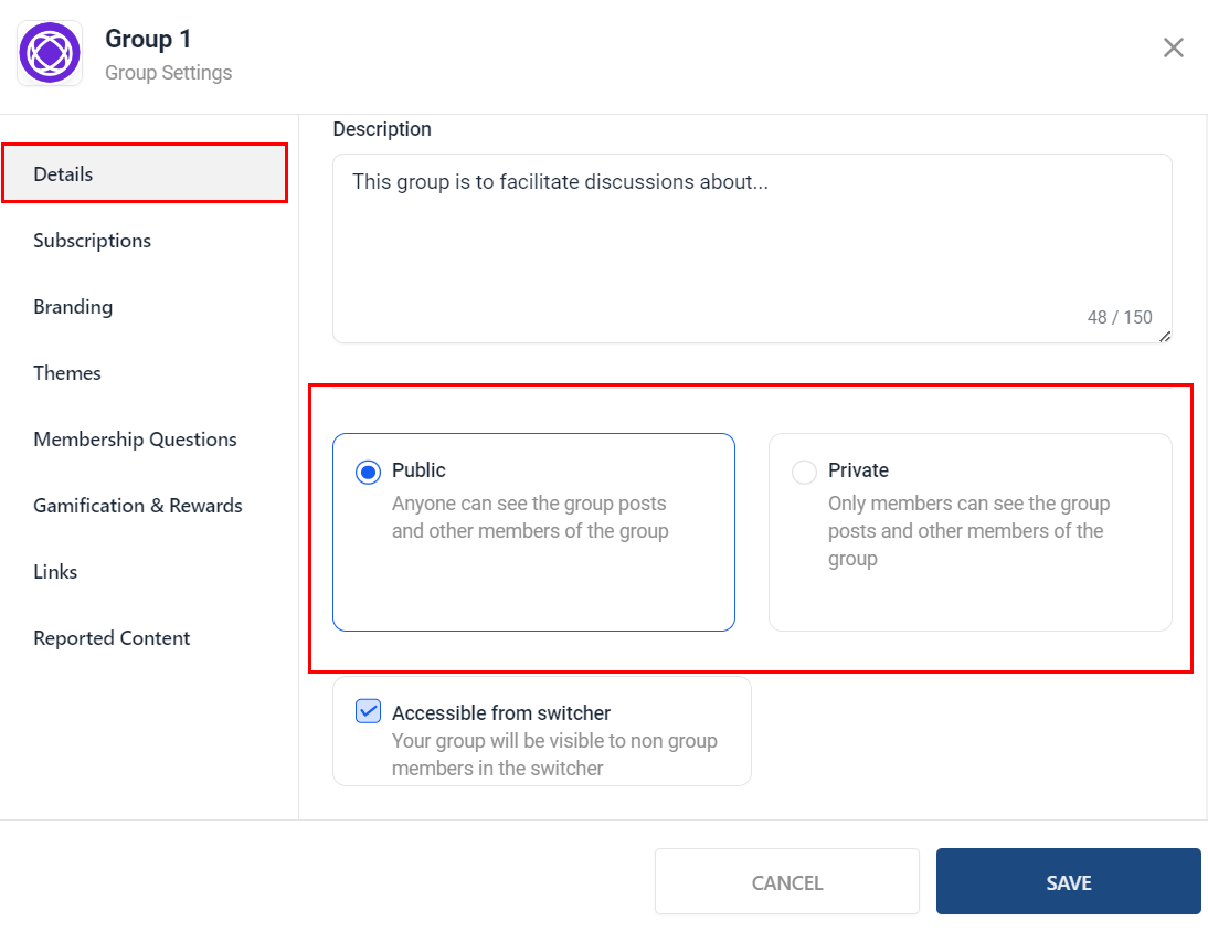 Administrators can decide whether their groups are Public, allowing open access to all, or Private, restricting membership to selected individuals. These settings can be customized within the group's management options.
