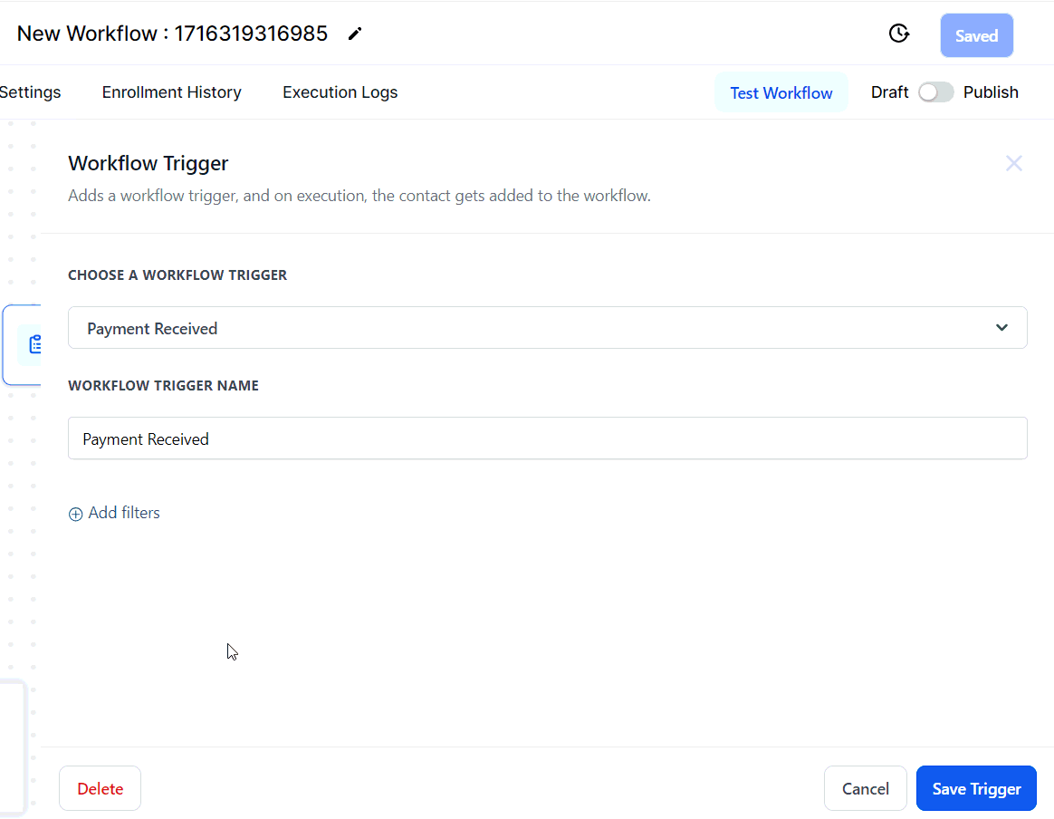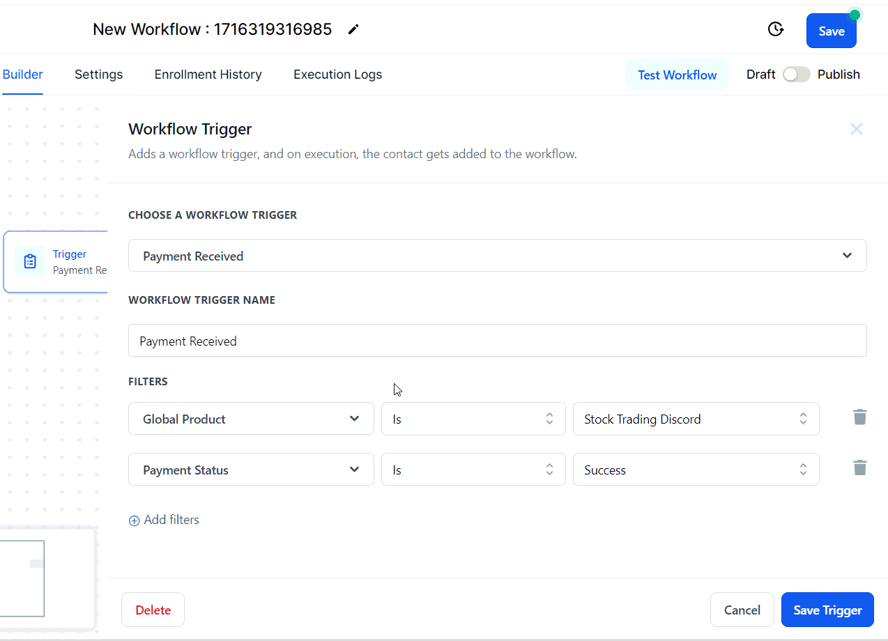 Add a filter for "Payment Status" and set it to "Success." This filter ensures the workflow is activated only for successful transactions. Remember to save your trigger.