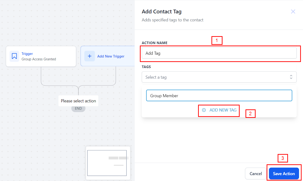 Add an action to tag new members, for example, with "Group Member." This helps you manage and identify members within your CRM. You can either create a new tag or select an existing one from the dropdown list.