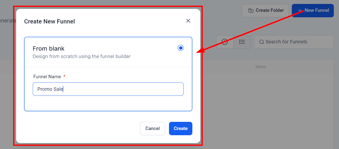 To better organize your funnels, you can create new folders by clicking the Create Folder button. A popup will appear, allowing you to name and save the folder.