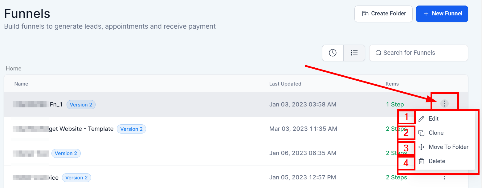 - Move Folder: If you’ve organized funnels into folders, you can move a funnel between folders.