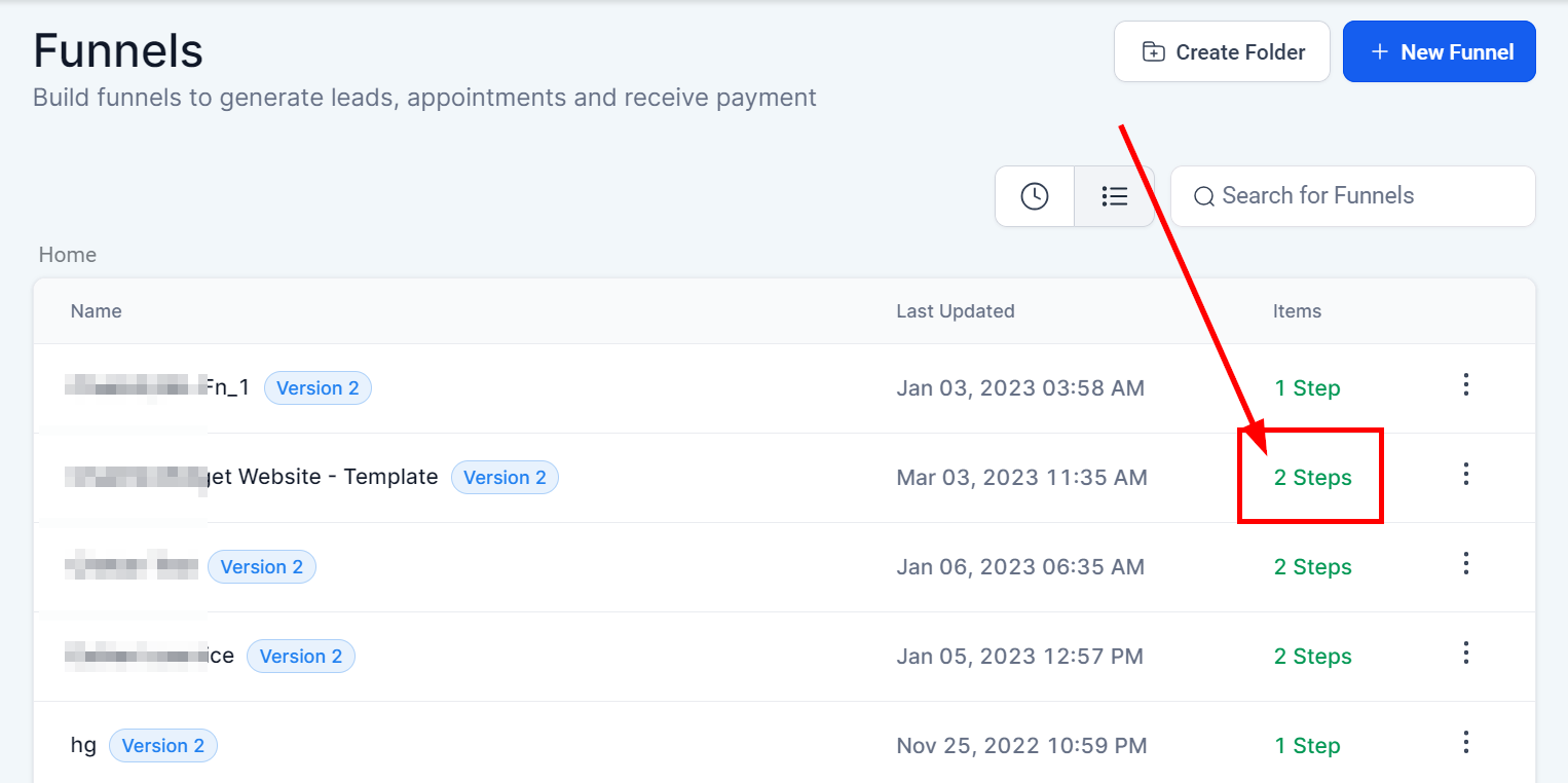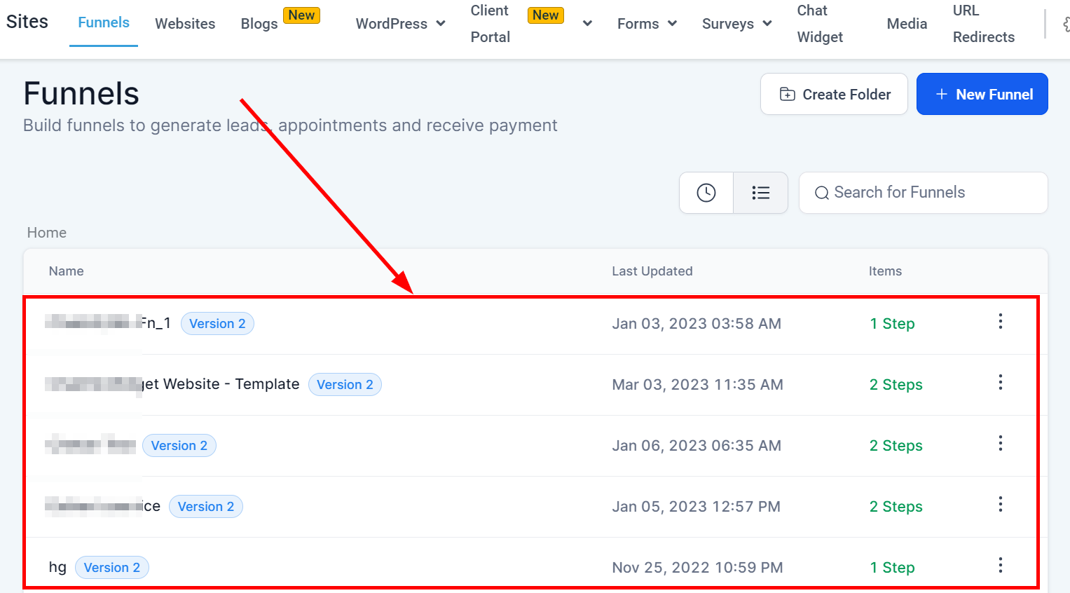 When you access the Funnels page, you’ll see a list of all your existing funnels and folders.