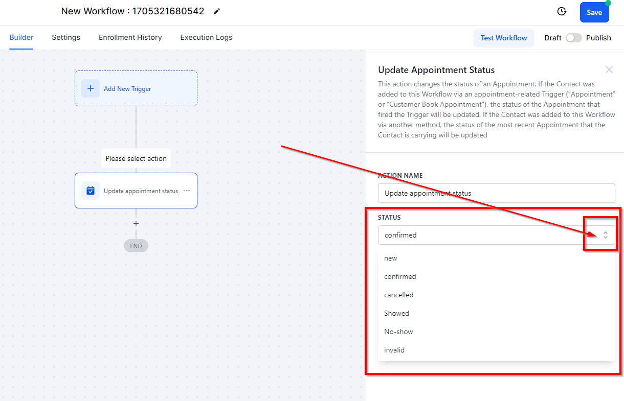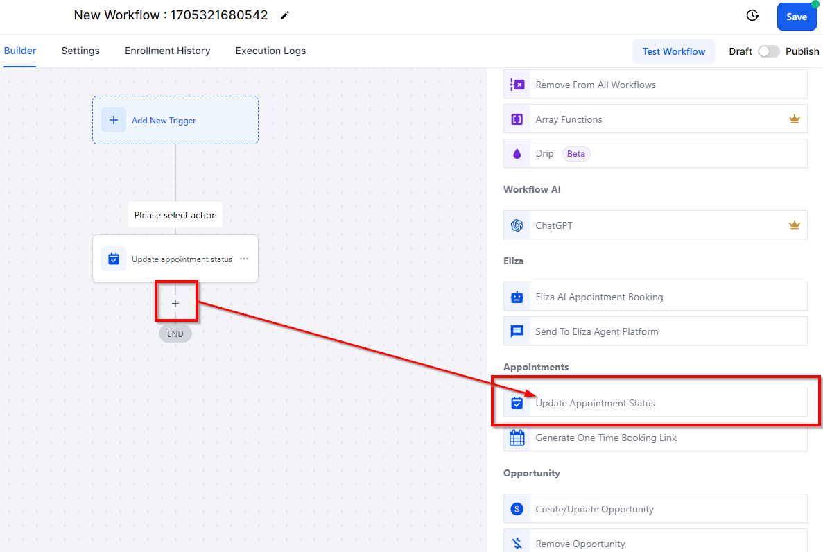 To update a contact's appointment status within a workflow, follow these steps: