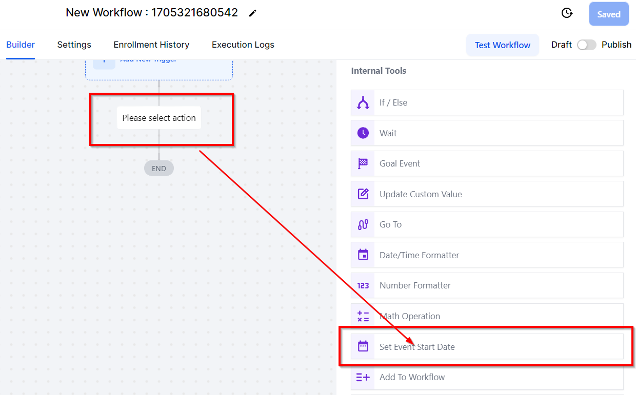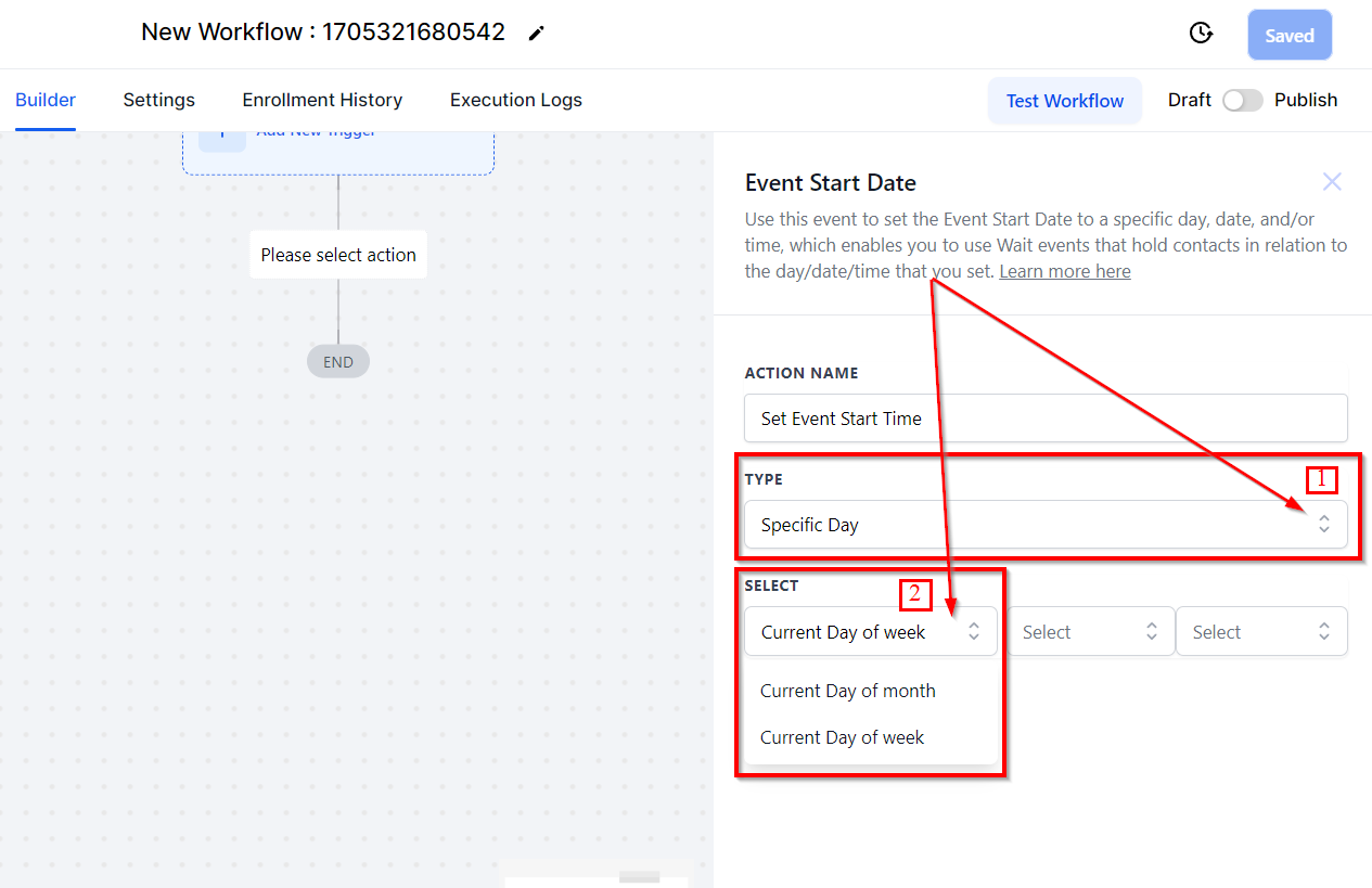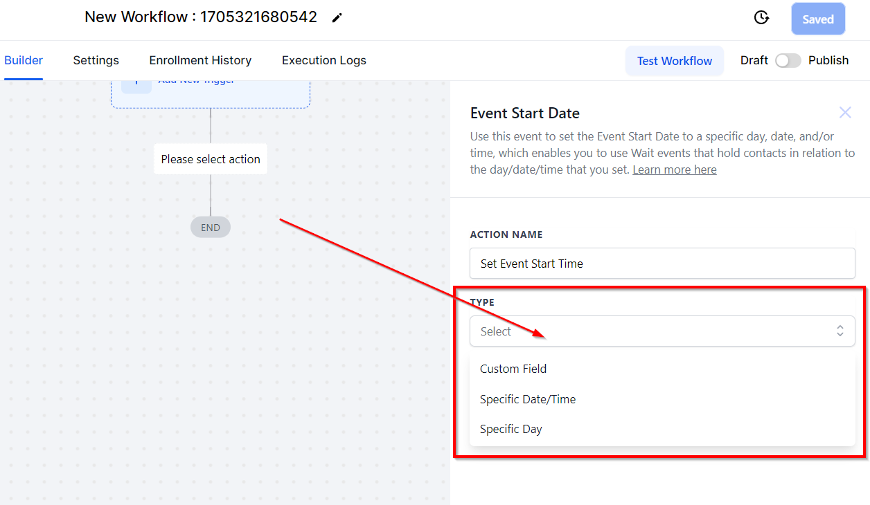 Within the Event Start Date action, there are various types available, each serving different purposes. These include options such as selecting a custom field, setting a specific date and time, or choosing a particular day.