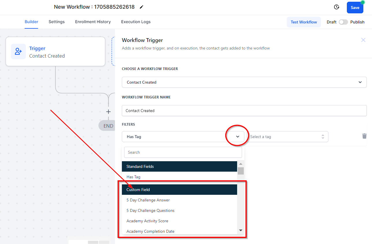 For workflows that depend on data entered into custom fields, select the relevant custom field filter. This setup ensures that the workflow triggers only when a contact fills out the custom field with the necessary information through a form on your website.