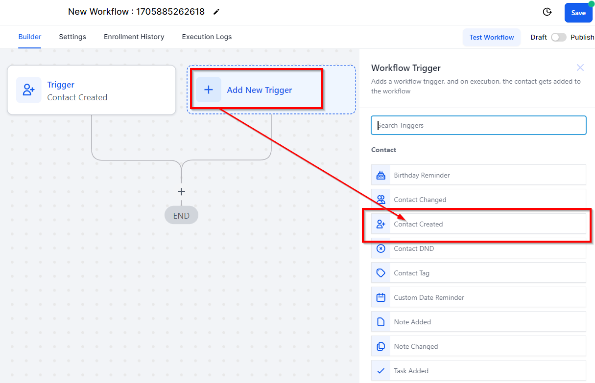 The "Contact Creation" trigger initiates a workflow when a new contact is added to your CRM system. You can tailor this trigger by applying various filters like tags or specific data fields. To set this up, start by clicking on the "Add New Workflow Trigger" button and selecting the "Contact Creation" option. This trigger is particularly useful for automating tasks such as adding tags to new contacts or sending follow-up communications after a form submission.