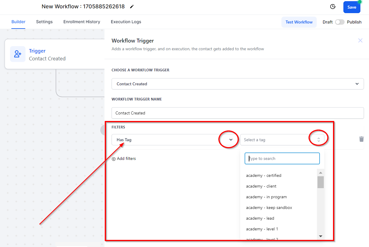 To activate workflows based on specific tags, choose the "Has Tag" filter and select the desired tag from your CRM. The workflow will only initiate when the selected tag is associated with a contact.