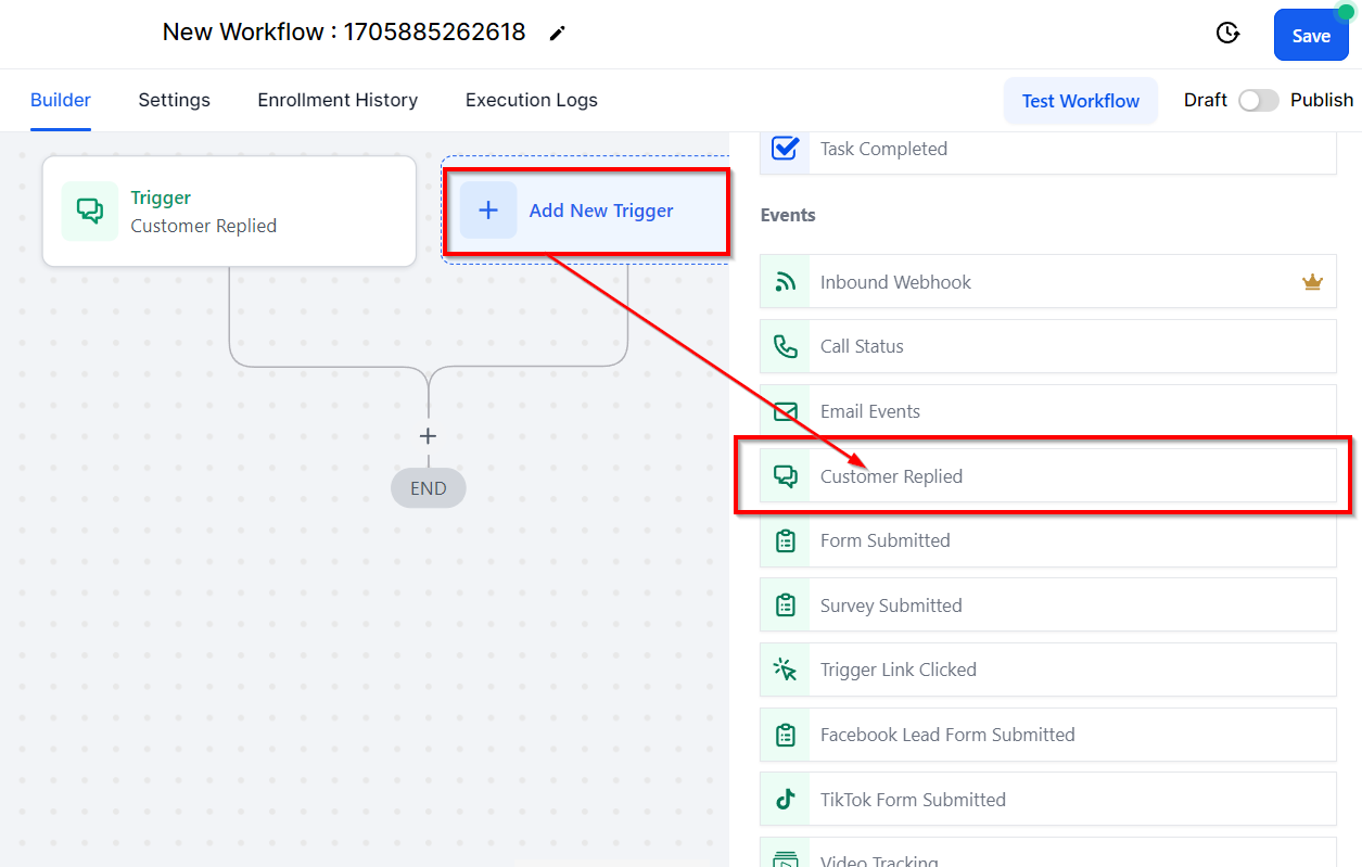The "Customer Response Trigger" is an advanced workflow tool designed to activate when a customer sends an incoming message. This versatile trigger allows for complex automation by incorporating various filters and variables. You can use this trigger to create workflows that initiate specific actions based on customer replies, whether they come from SMS, email, or another communication channel.