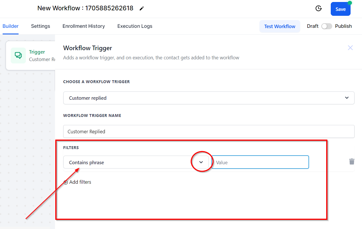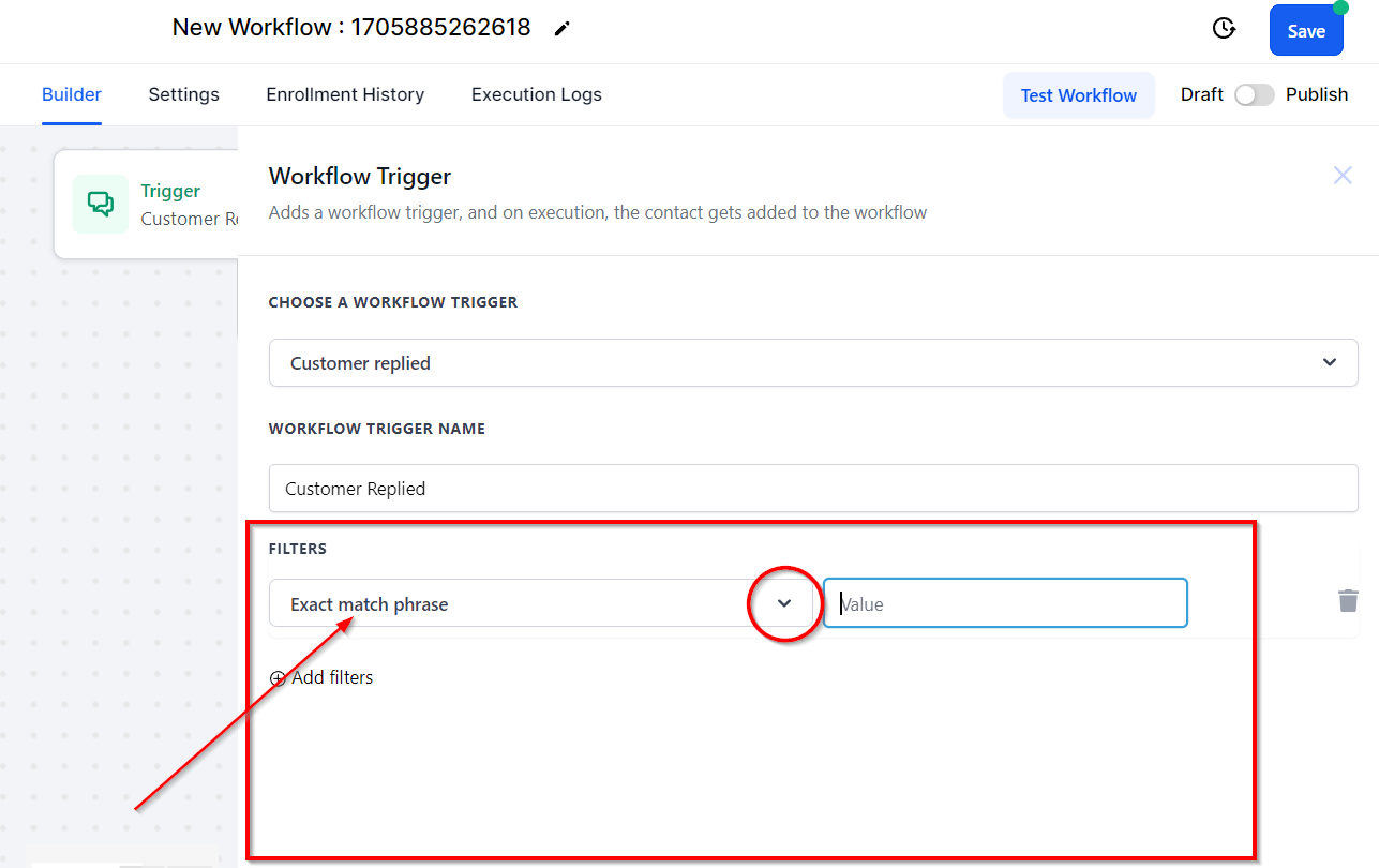 To refine the trigger to only respond when a customer uses a particular phrase, you can use the "Phrase Containment" filter. The workflow will activate if the incoming message includes this specific phrase, even if other words are present.