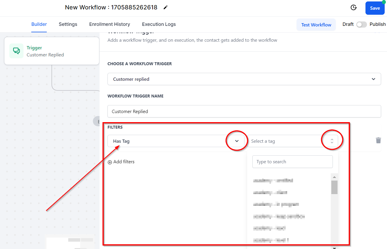 By using the "Tag Inclusion" filter, the workflow can be set to trigger only when a specific tag is associated with the contact’s record in the CRM.
