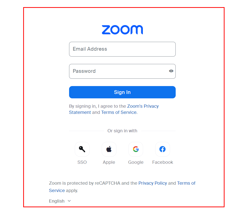 On the Zoom sign-in page, enter your login credentials and click "Sign In". You can also choose to log in using SSO, Apple, Google, or Facebook, depending on your preference.