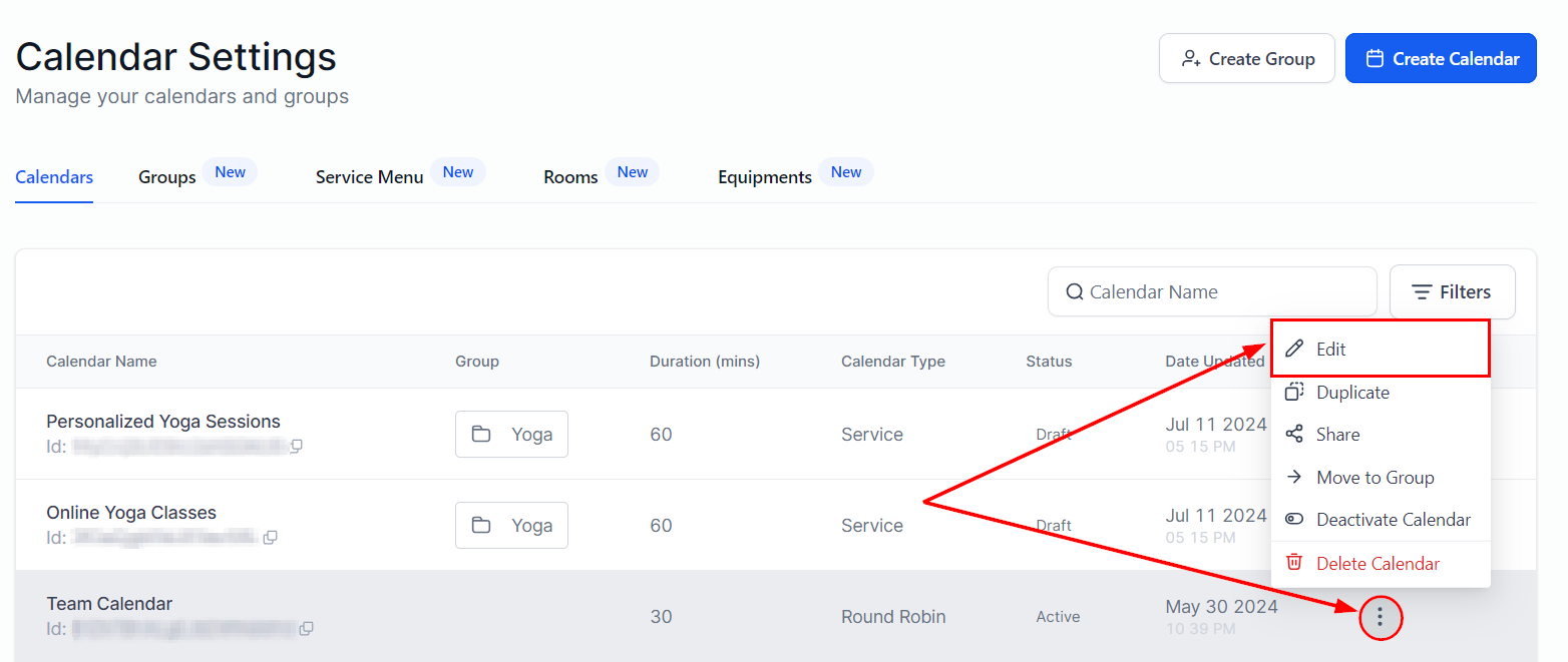 To modify an existing Round Robin calendar, click the three-dot action menu next to the calendar and choose "Edit." Alternatively, you can create a new Round Robin calendar.