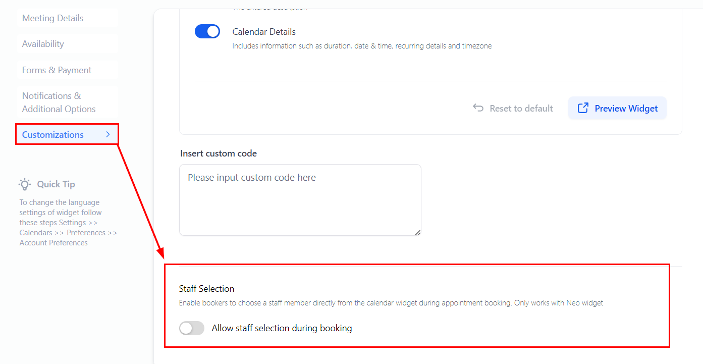 To allow contacts to select their preferred staff member, go to the "Staff Selection" option within the Calendar customizations and toggle the switch.