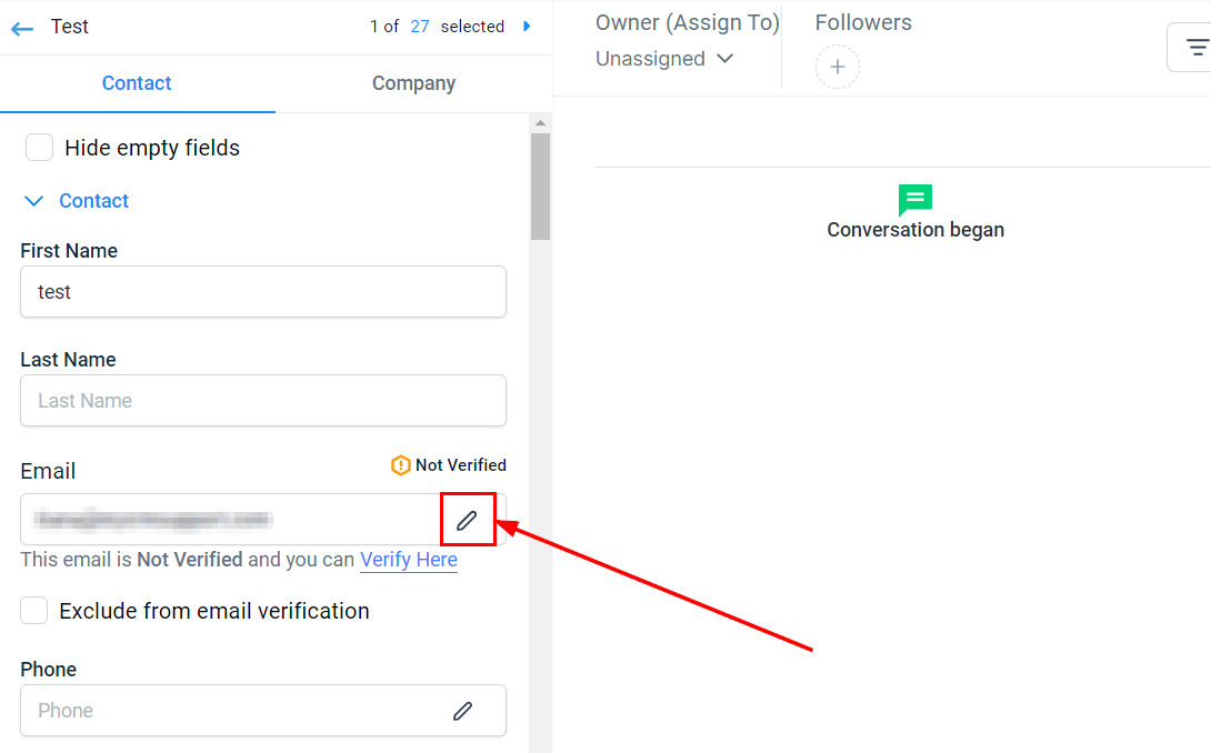 For existing contacts, locate the desired contact and click the pencil icon next to the email field to edit their details.