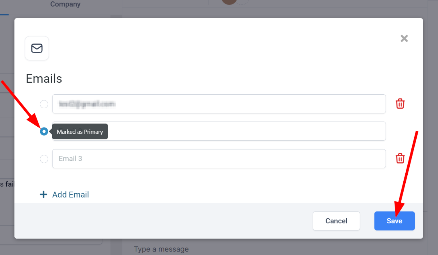 Setting the Primary Email Address: To set an email as the primary one, click the circle next to the email address you want to designate as primary. This primary email will be used by default for all communications with the contact. Remember to save your changes after making any updates.