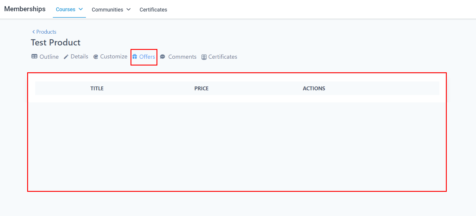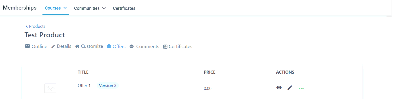 The "Offers" tab allows you to manage any course-related offers linked to the product, including titles, prices, and checkout options.