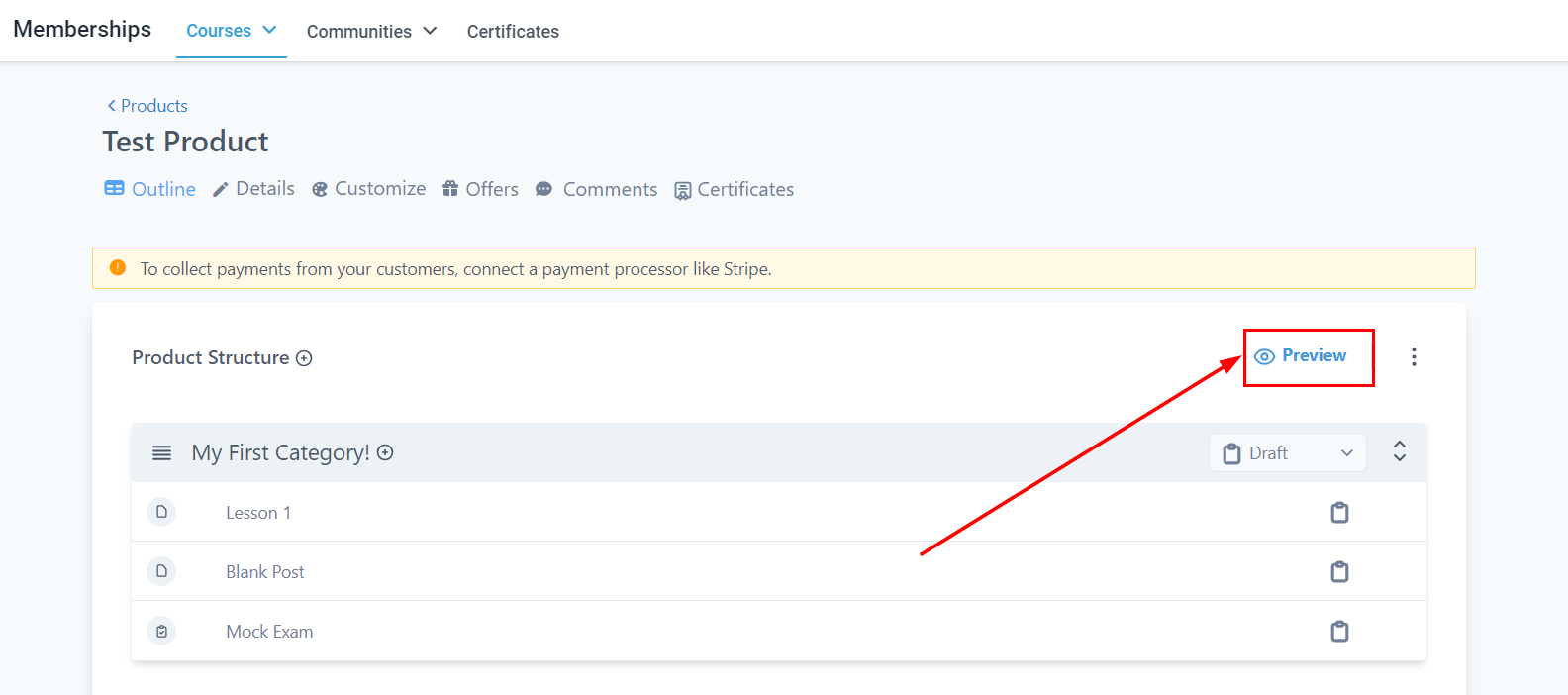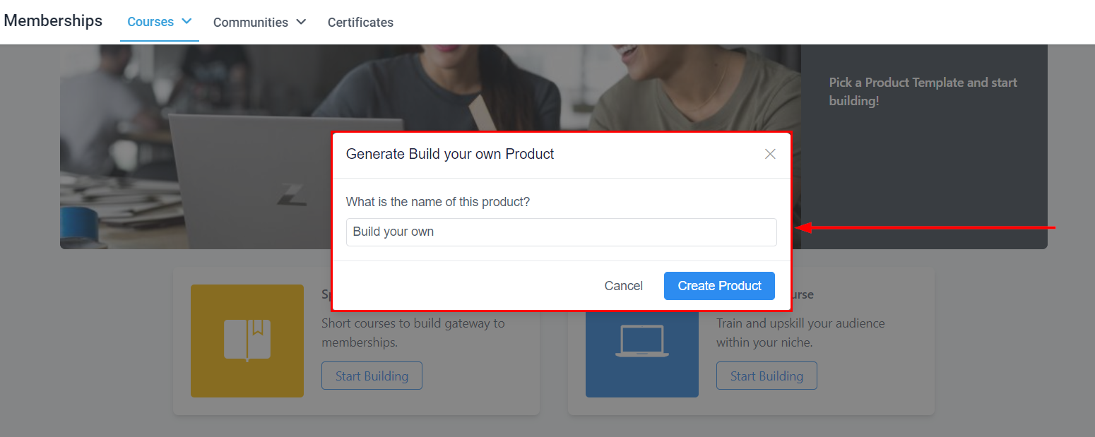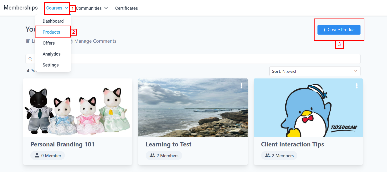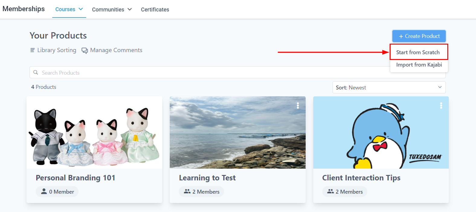 To start, go to the "Memberships" section of your dashboard. Within this section, you'll find the "Products" option, where you can view existing courses or initiate a new one. By selecting "Create Product," you'll have the option to either use a pre-designed template or build a course from scratch.