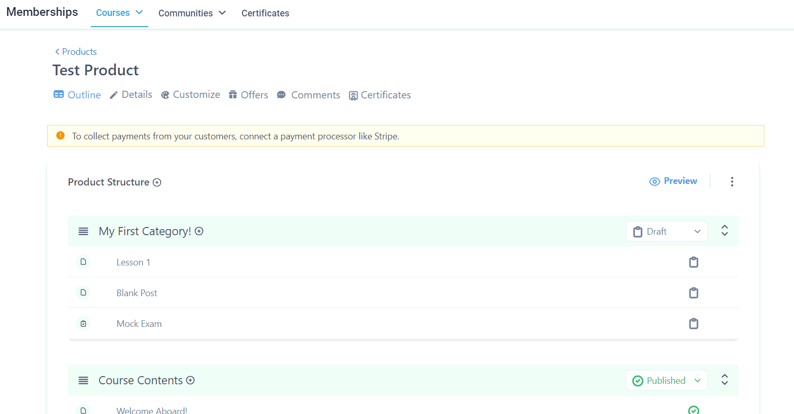 After setting up your course, you can manage all your course offerings from the "Your Products" page. This central hub allows you to preview, edit, clone, and share courses easily, keeping everything organized and accessible.