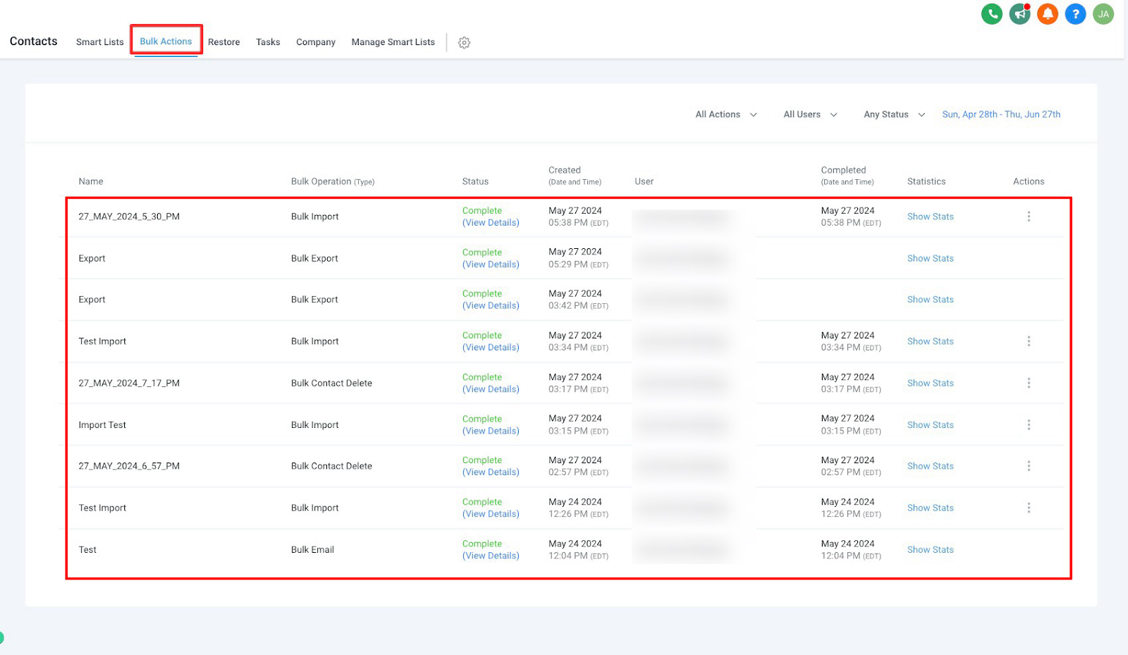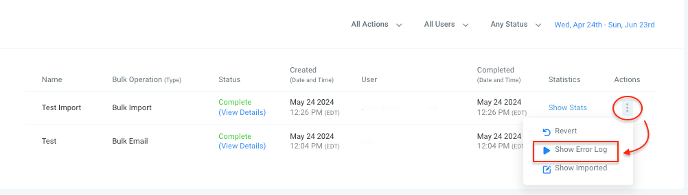From there, proceed to the 'Bulk Actions' area. Here, you'll find records of your recent CSV imports, including any that may not have been fully successful.