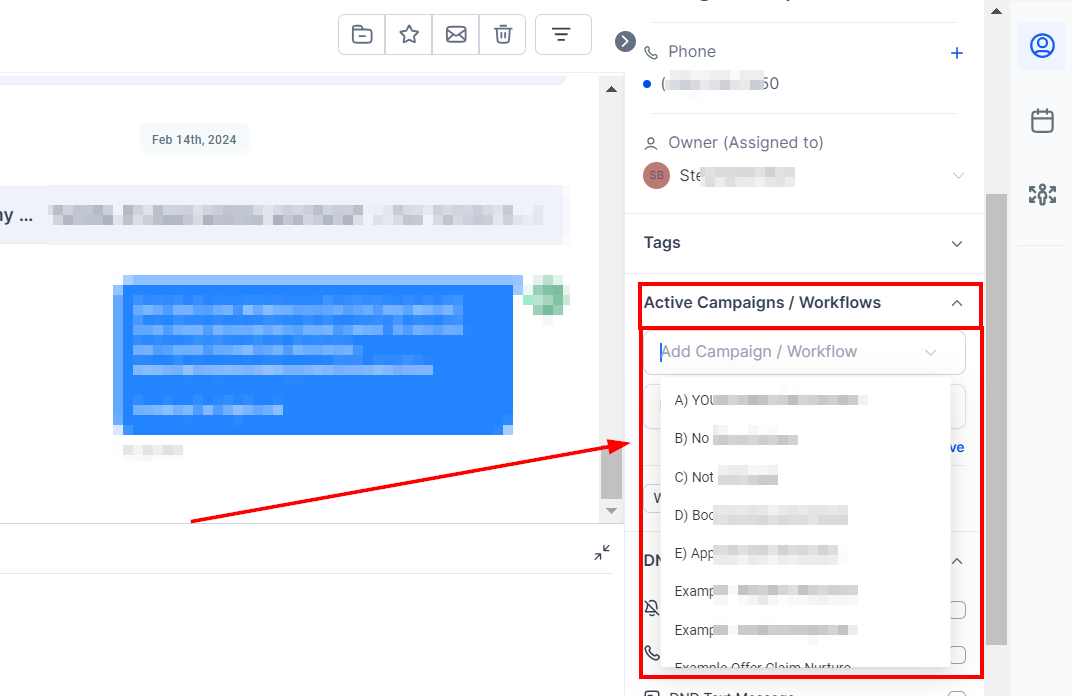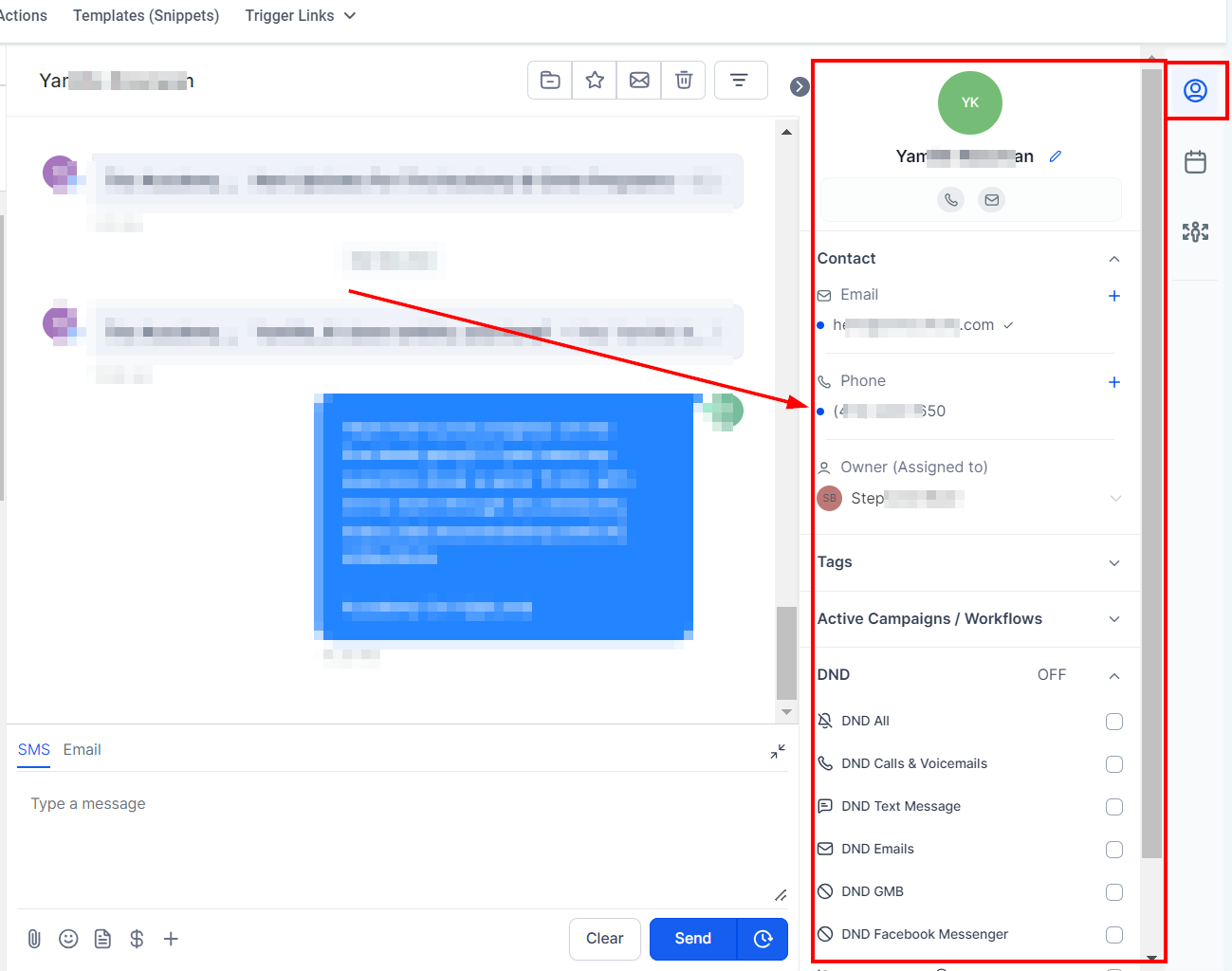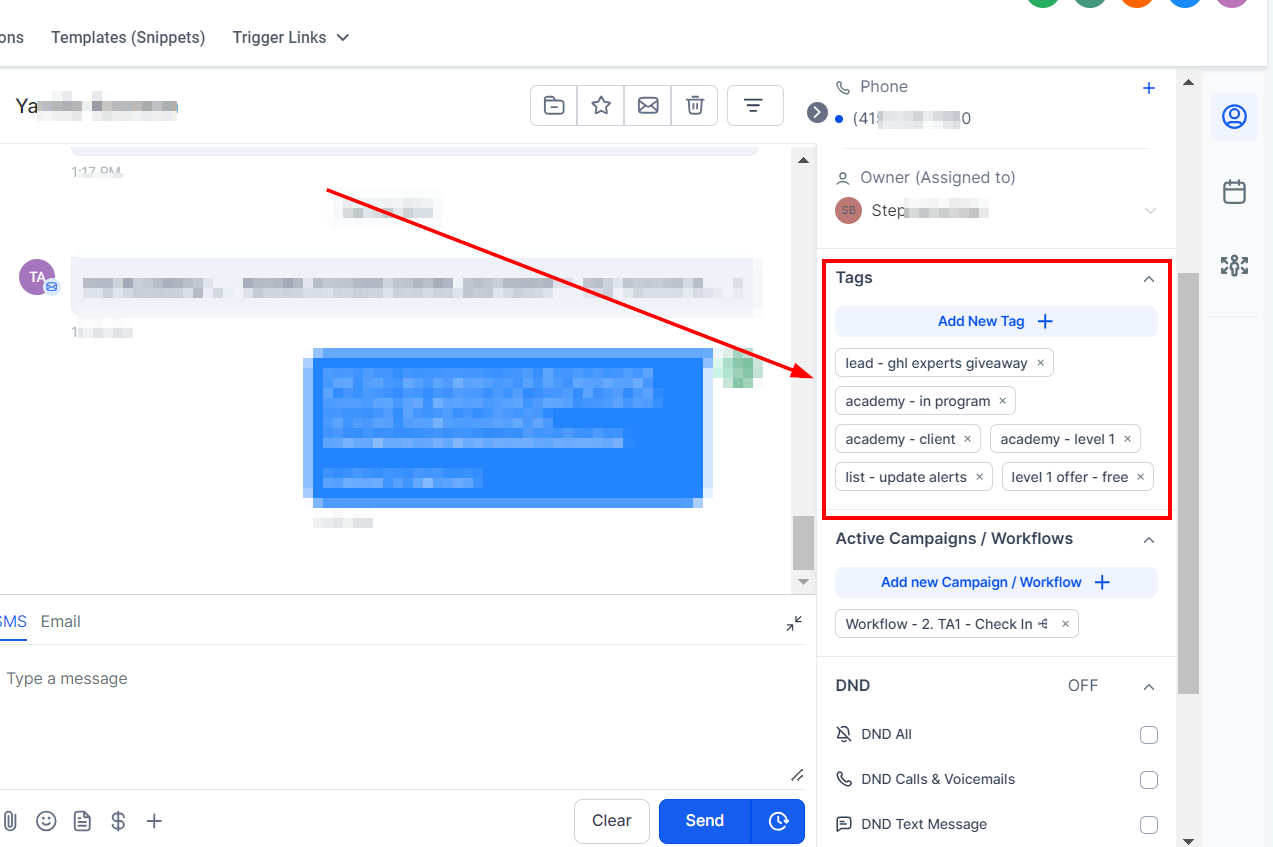 This section provides a summary of key details, including the contact's name, phone number, and email address. It also offers quick access to additional features like tags, Do Not Disturb (DND) settings, and any active campaigns or workflows the contact is involved in.