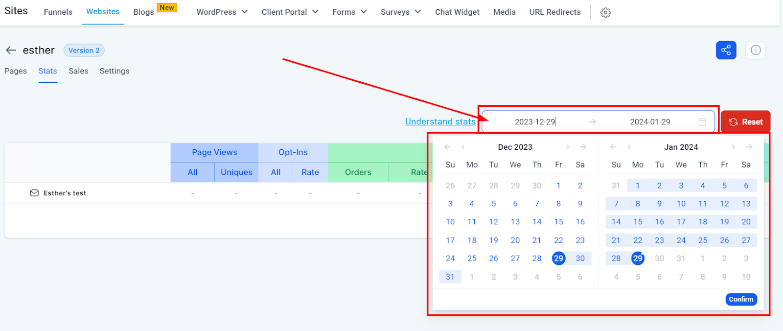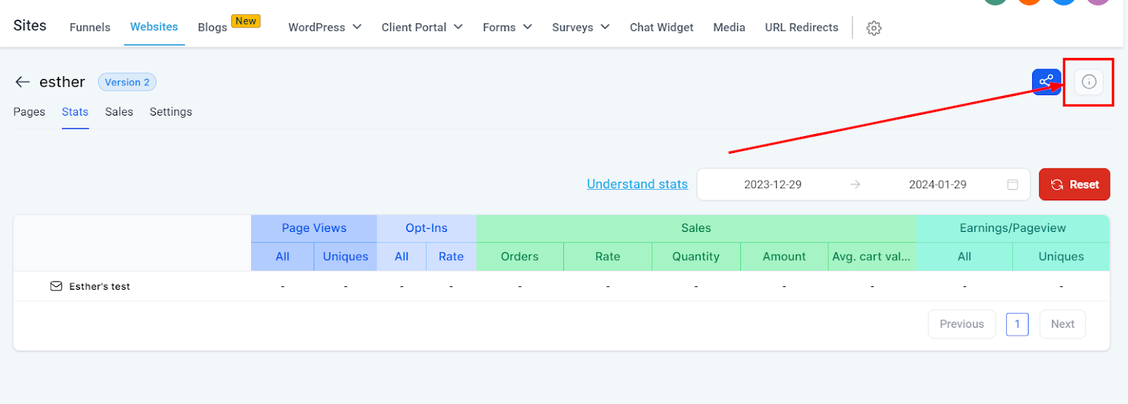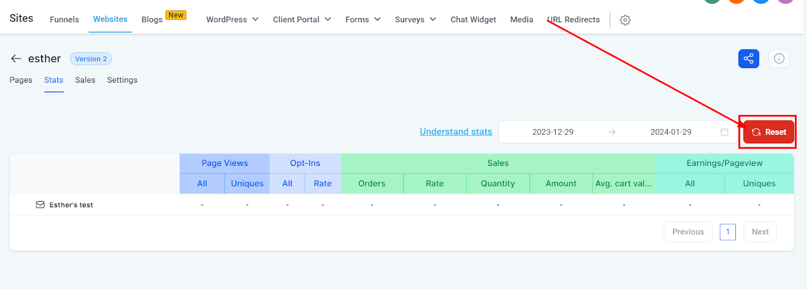 If you wish to clear all the statistics from your website, click the "Reset" icon. Please note that resetting will permanently erase all data, and this action cannot be undone. However, statistics generated within the last 30 minutes will not be deleted.