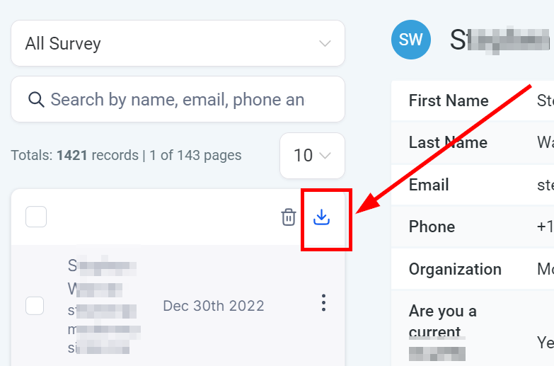 To download an individual survey submission, click the download icon next to the relevant entry.