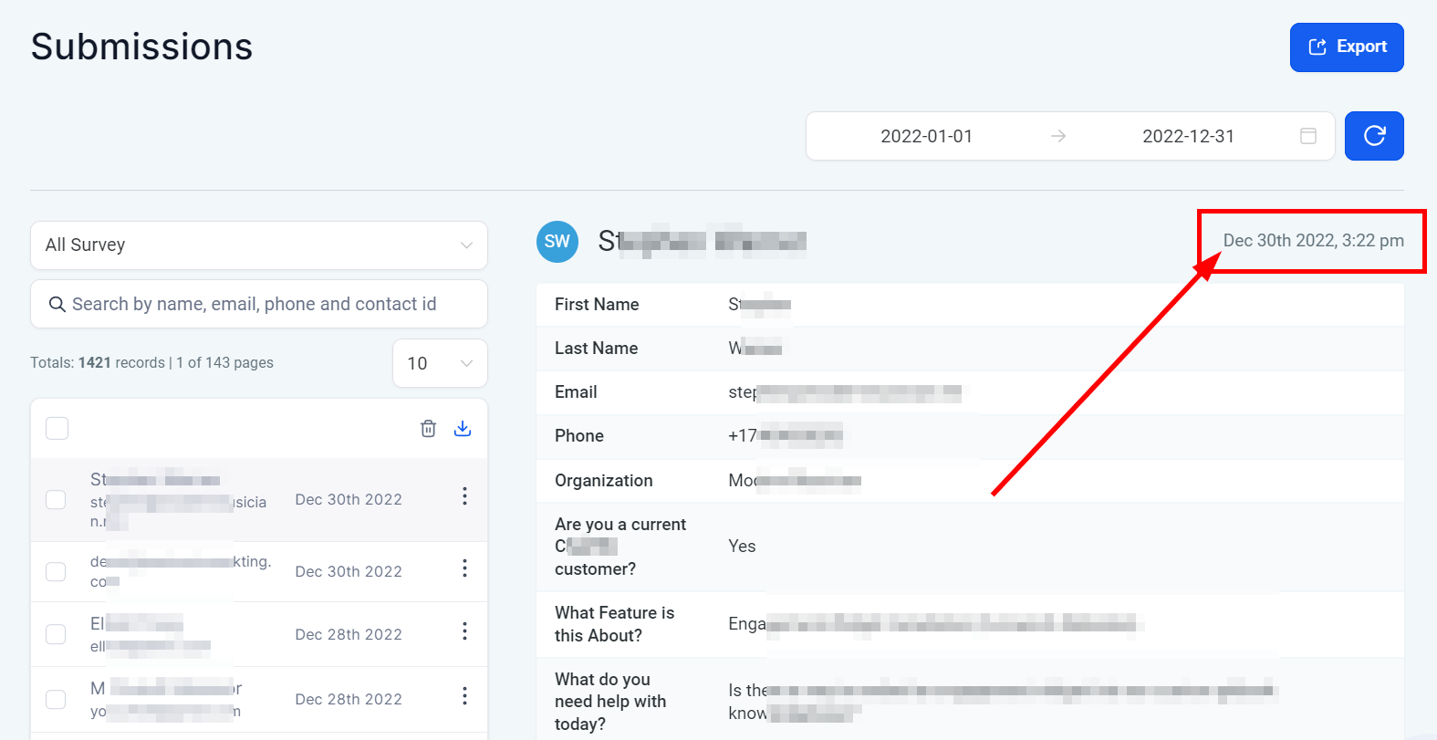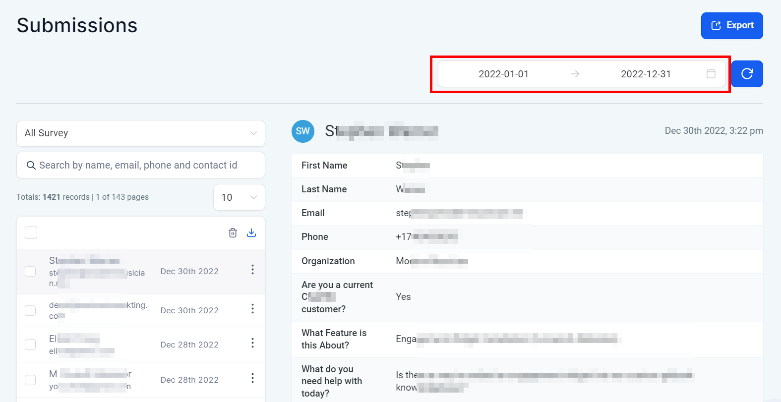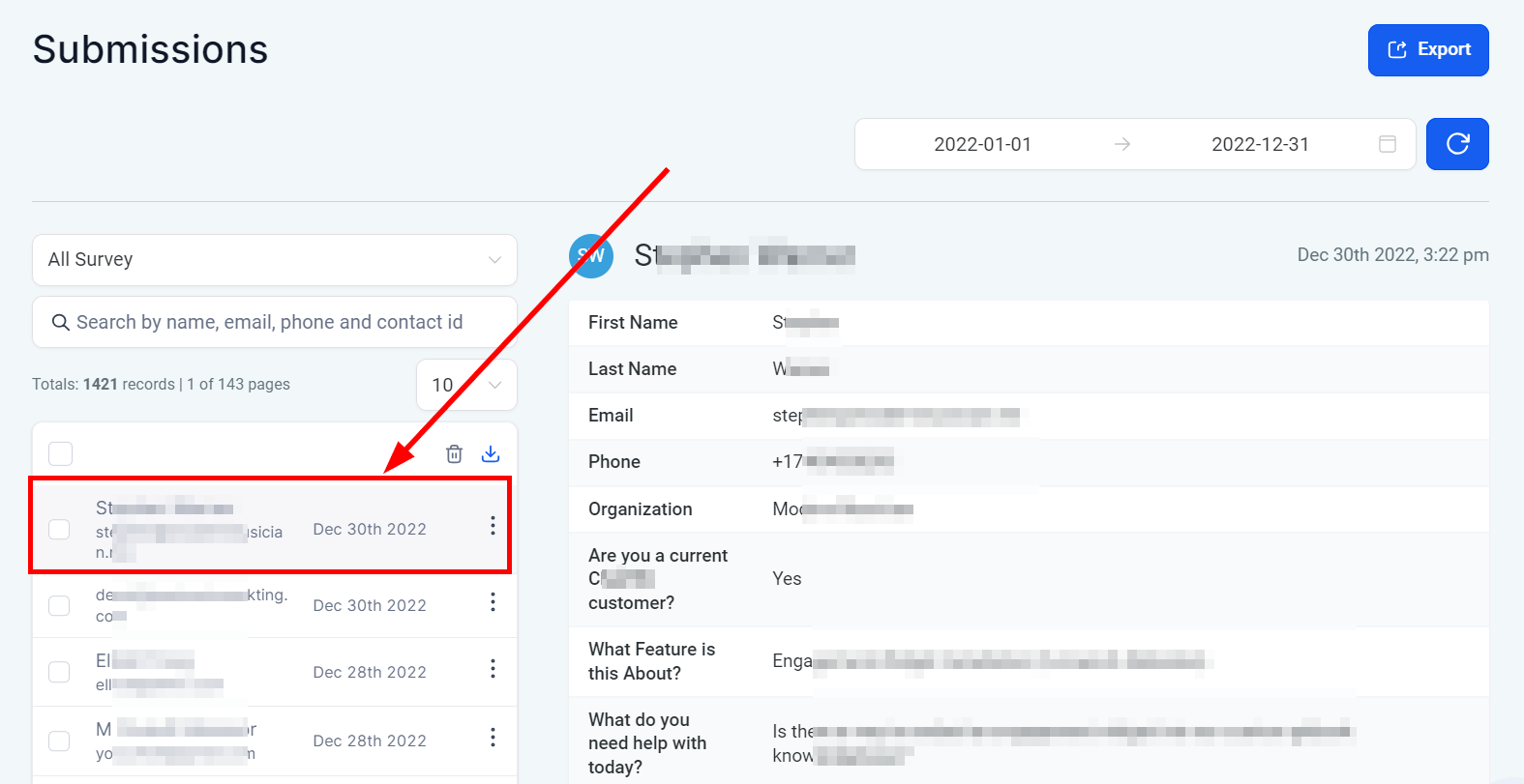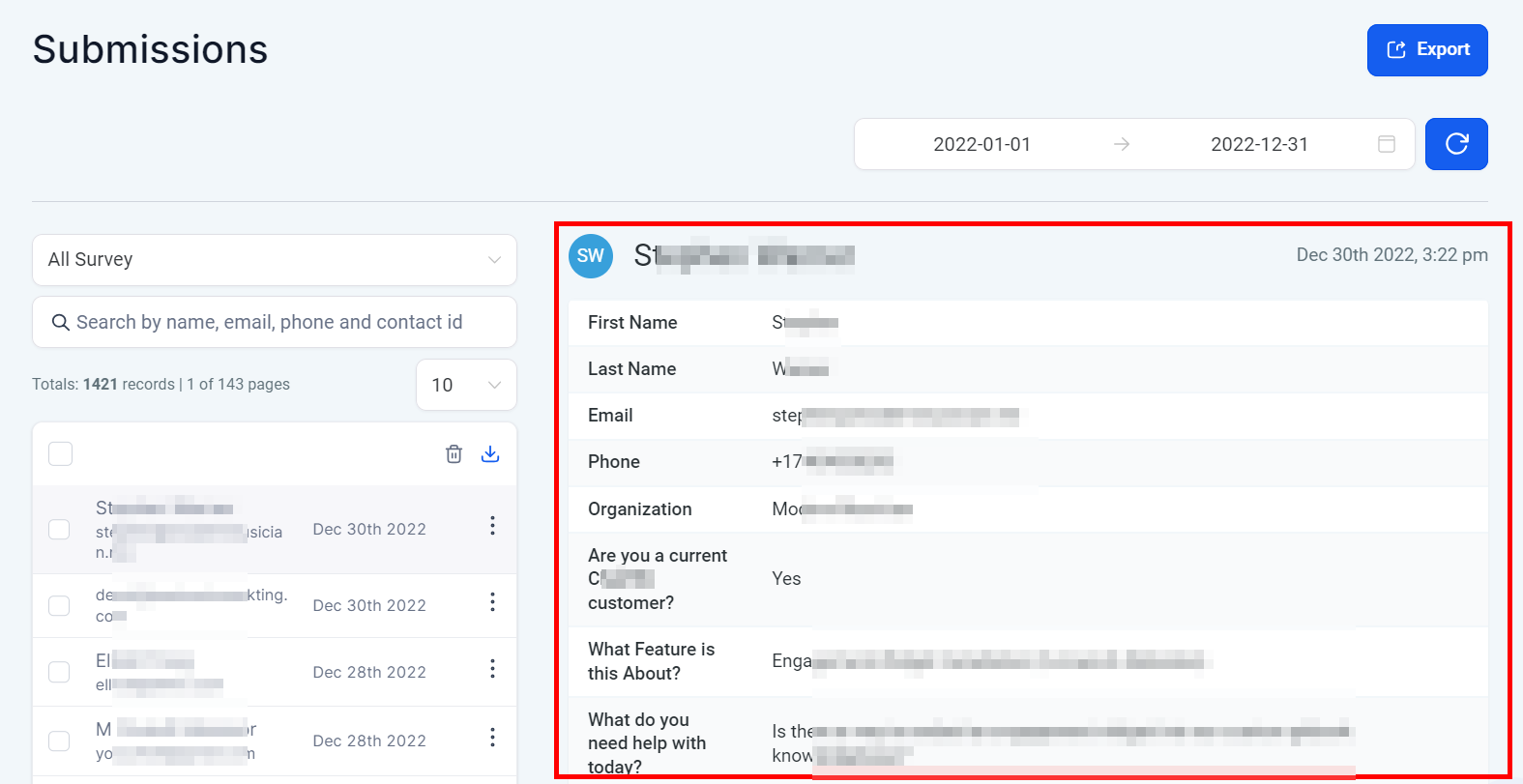 On the left side of the screen, you’ll see a list of all survey submissions. Clicking on any submission from this list will display the full details on the right side of the page.