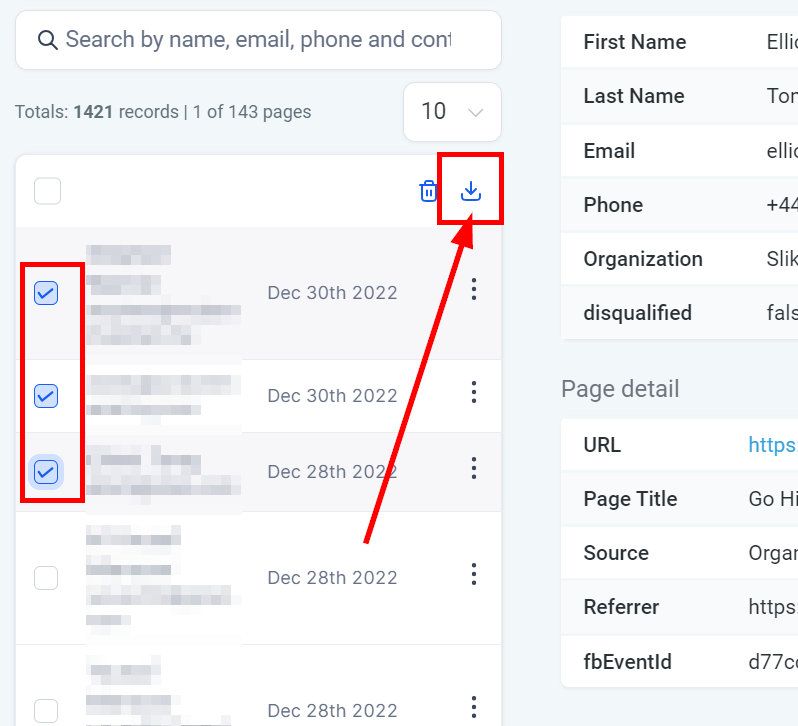 Each submission will display key details such as the respondent’s name, email, and submission date. You can also select multiple submissions by checking the boxes next to each entry.