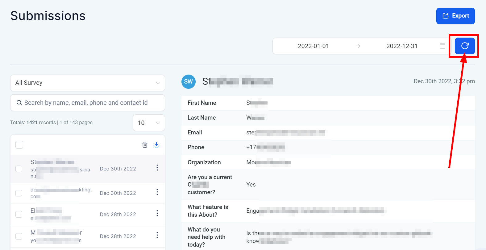 To ensure that your data is current, you can refresh the survey results by clicking the refresh button next to the date range selector. This will update the list with the most recent submission data.