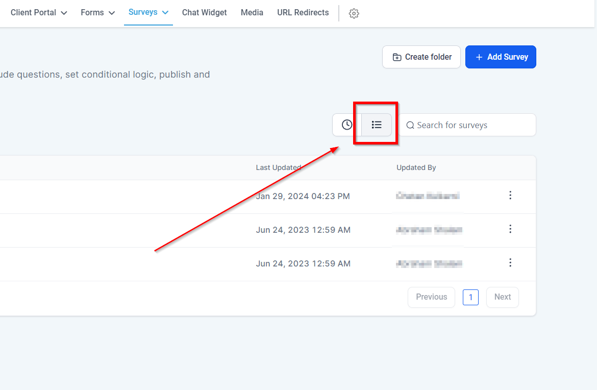 This tab provides a list view of your surveys. If you have switched to another view like "Recent," you can return to the list view using this tab.