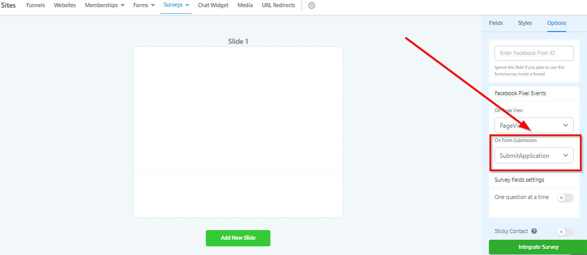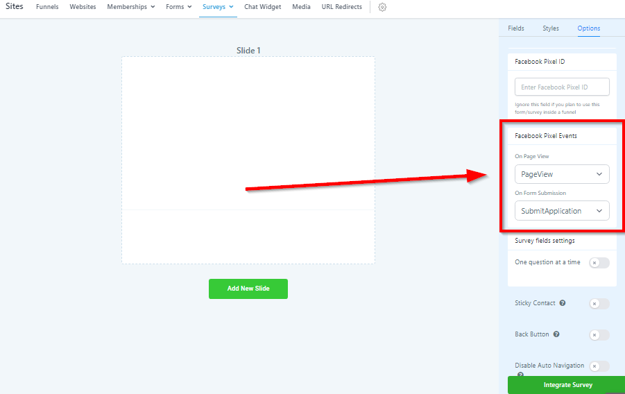 Use the Facebook Pixel to track survey submissions and gather data for analytics and ads. Skip this field if the survey is embedded in a funnel.