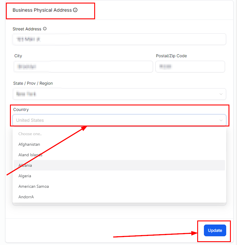 3. Modify Country: In the Business Physical Address section, locate the "Country" field. Use the dropdown to choose the country that corresponds to the currency you wish to apply.