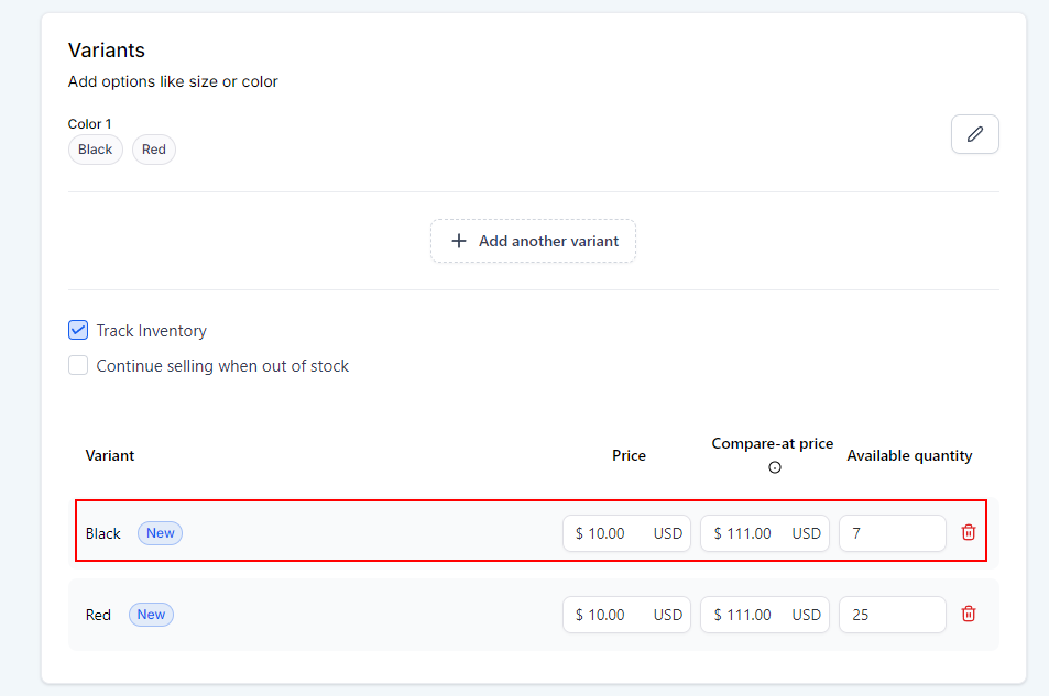 Each variant can have its own price and inventory settings, allowing for customized tracking and pricing per option.