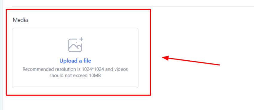 You also have the option to include an image or video to visually represent your product. To add media, click the designated button and choose the file from your device. The recommended resolution for images is 1024x1024 pixels, and videos should not exceed 10MB. Supported formats for images are PNG and JPG.