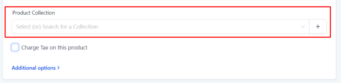 You can categorize your products by assigning them to collections. To do this, use the dropdown menu to select the appropriate collection. Additionally, if taxes apply to the product, you can add them by checking the relevant box, which will display a list of available tax options created within your account.