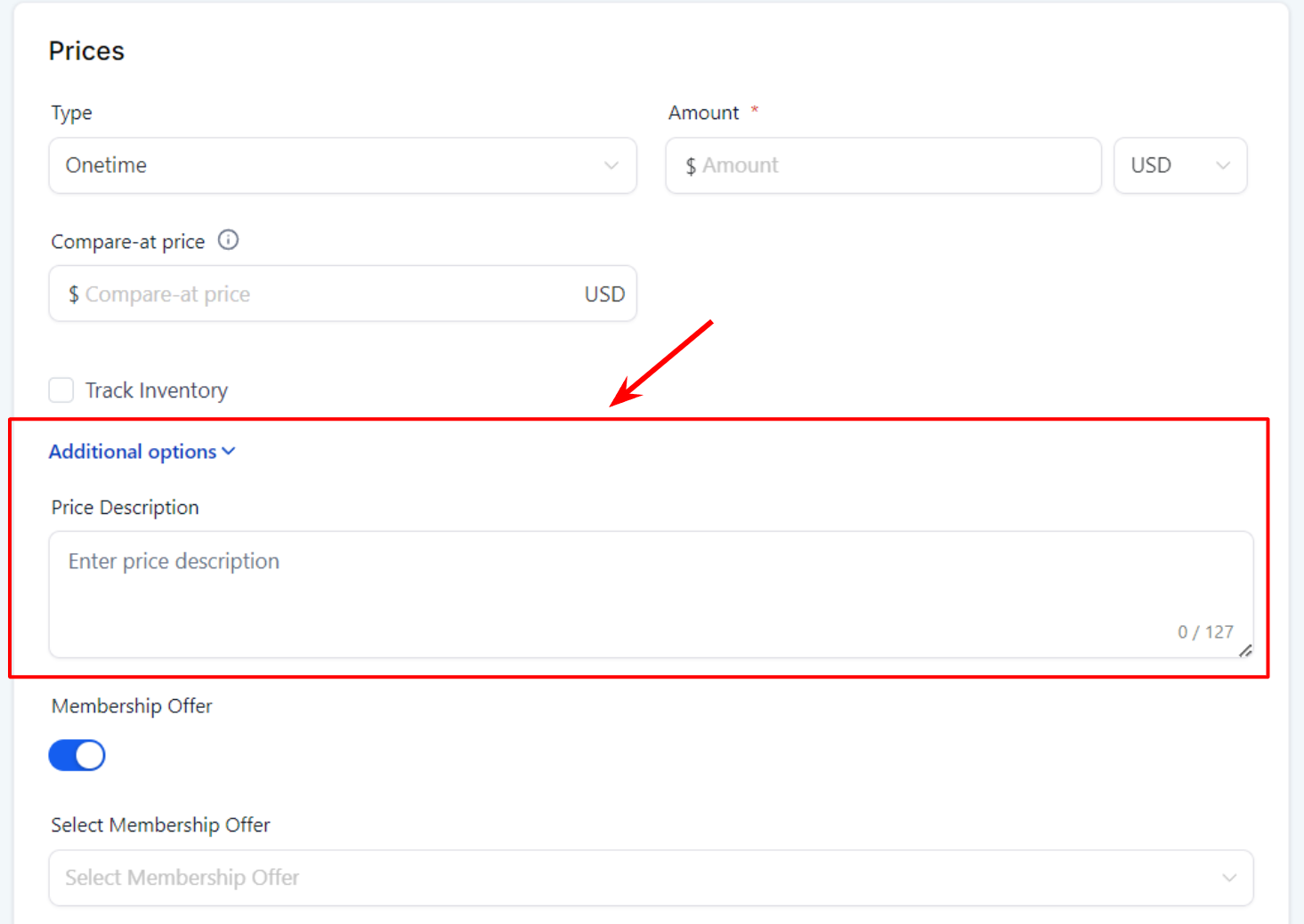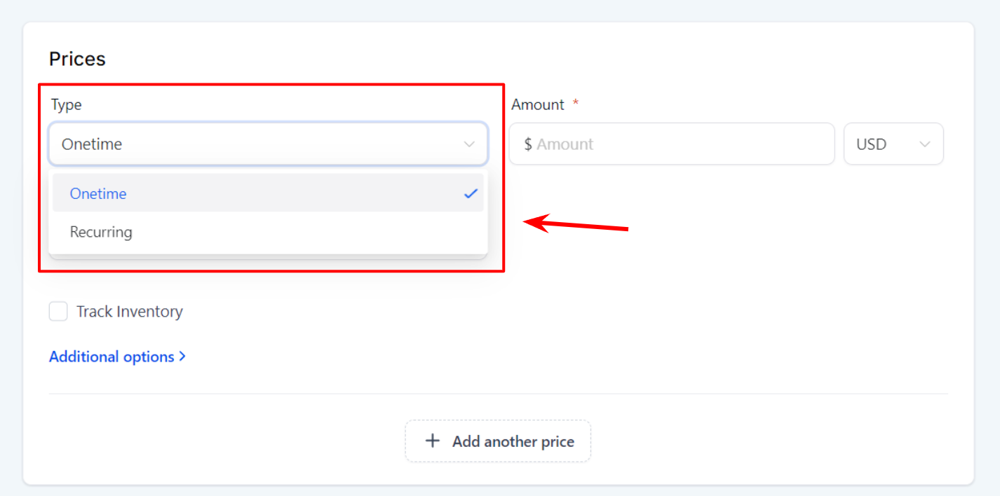 In the pricing section, you’ll need to enter essential information such as the price, currency, and whether the product is a one-time purchase or part of a subscription plan.