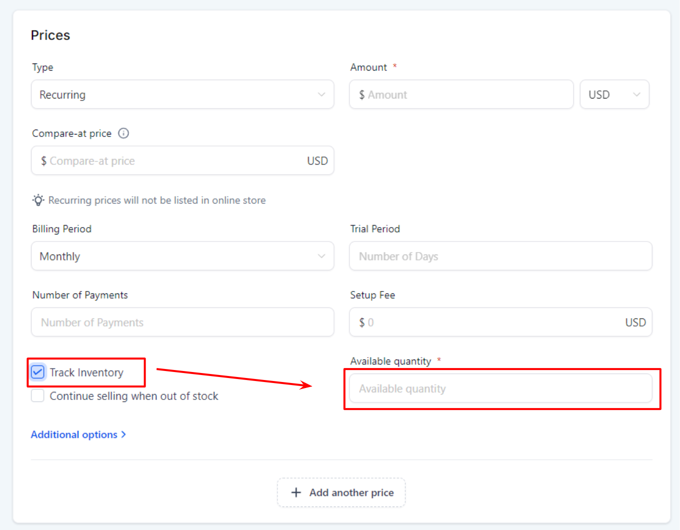 To track product inventory, check the appropriate box and input the available stock quantity. The system will automatically update the inventory after each sale. Once the stock reaches zero, the product will be marked as unavailable unless you choose to allow sales to continue regardless of stock levels.