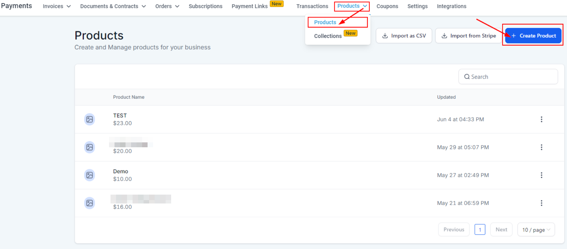 Adding new products to your CRM can be done quickly and easily. Start by navigating to the Payments tab within your CRM and then click on the Products option located at the top of the page. On the right-hand side, you'll find a blue button labeled Create Product. Once you click this button, you'll be directed to a new screen where you can input the necessary details for your product.