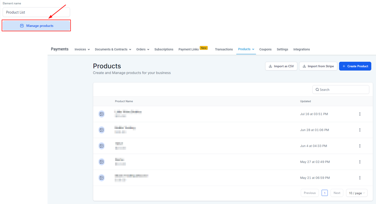To make changes, simply open the settings panel on the right side. Clicking on "Manage Products" will take you to the product management tab, where you can edit or add new items.