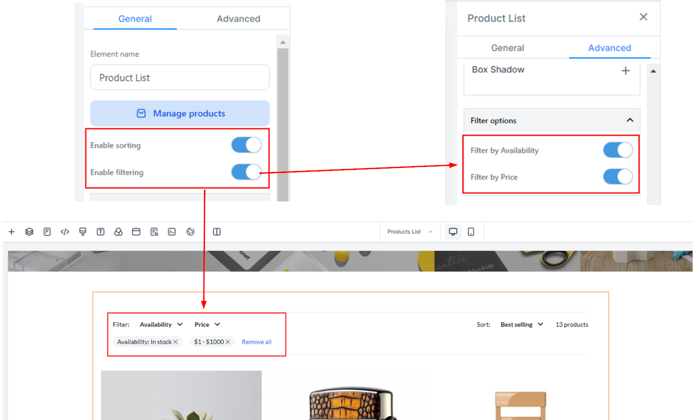 You can enhance the shopping experience by enabling filters and sorting features, giving customers more control over their search results. In the Advanced section, filtering can be limited to criteria such as Availability or Price.