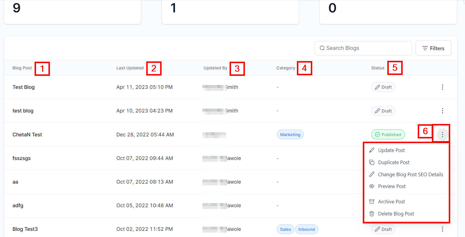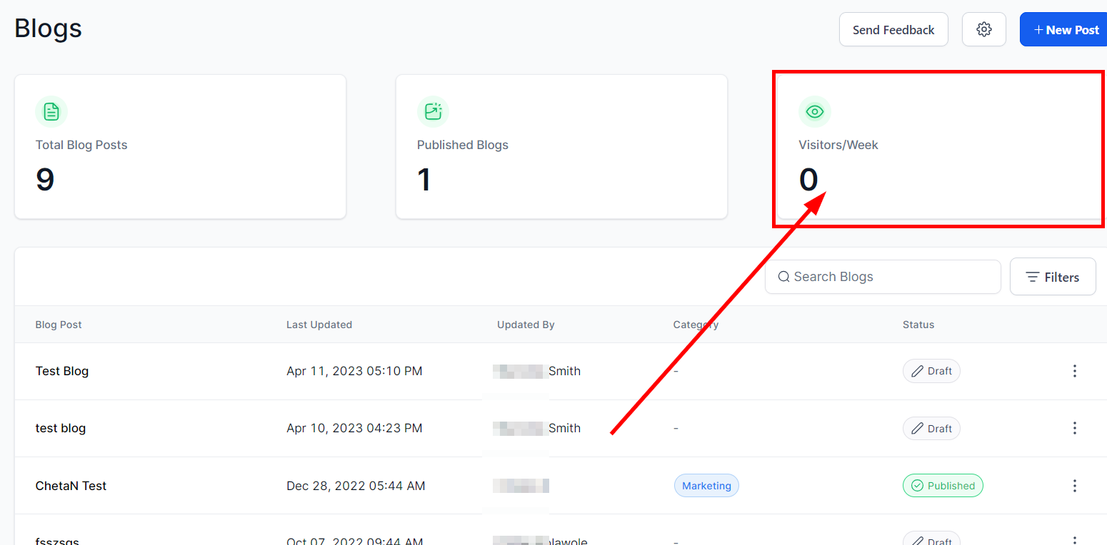 Here, you can keep track of all the blog posts created by you or your team, providing an overview of the number of posts.
