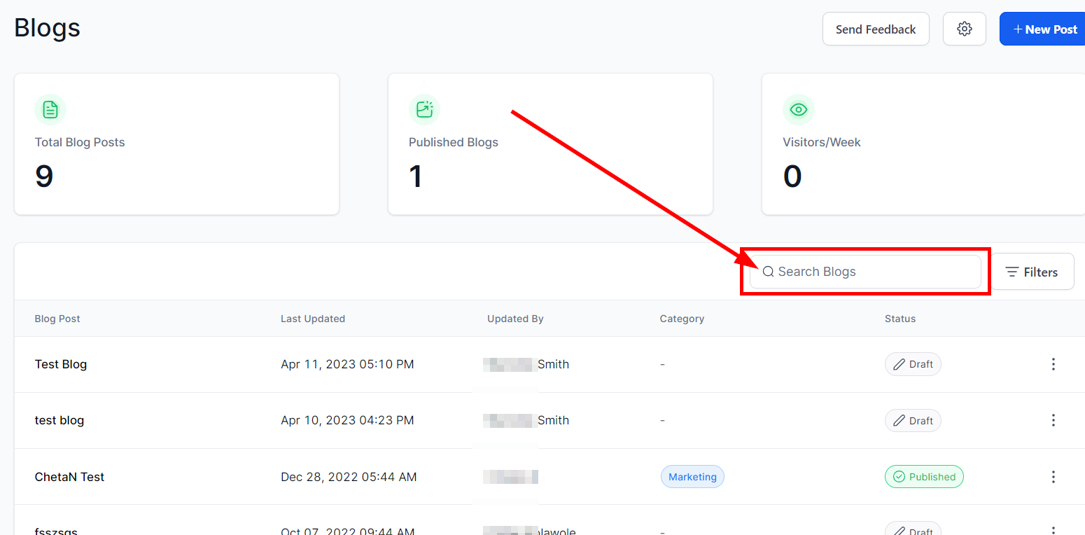 With a long list of blogs, this search bar helps you quickly find specific posts by name.