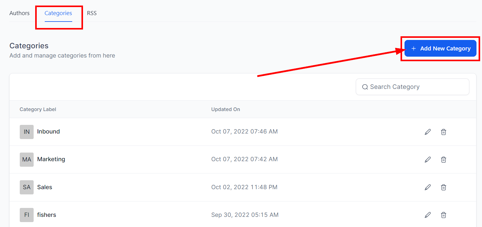To edit a category, click the pencil icon next to the category name. Make any changes and save by clicking Update Category. To delete a category, use the trash icon.