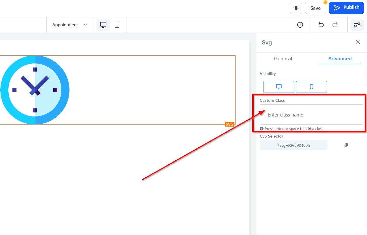 The Custom Class feature lets you assign a custom CSS class to an element, which makes it easier to apply specific styles to that element. Enter your desired class name in the field provided.