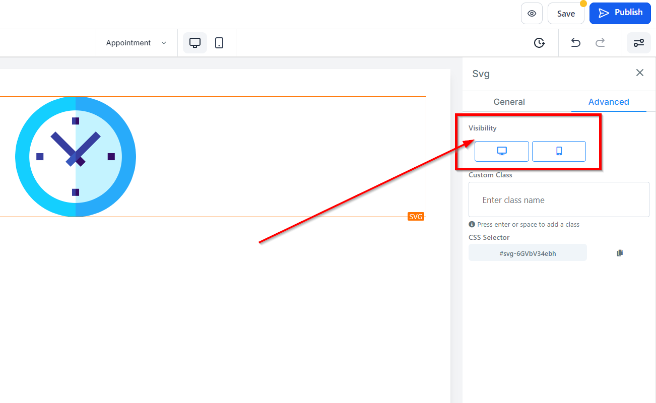 The Visibility Controls allow you to specify whether the selected element is visible on mobile devices, desktops, or both. Just click on the appropriate icon to choose.