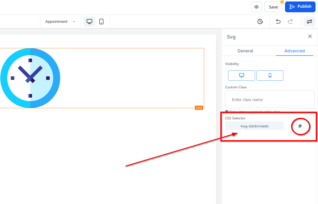 To quickly copy your custom CSS code, click the Copy icon next to the reference code in the CSS Selector section.